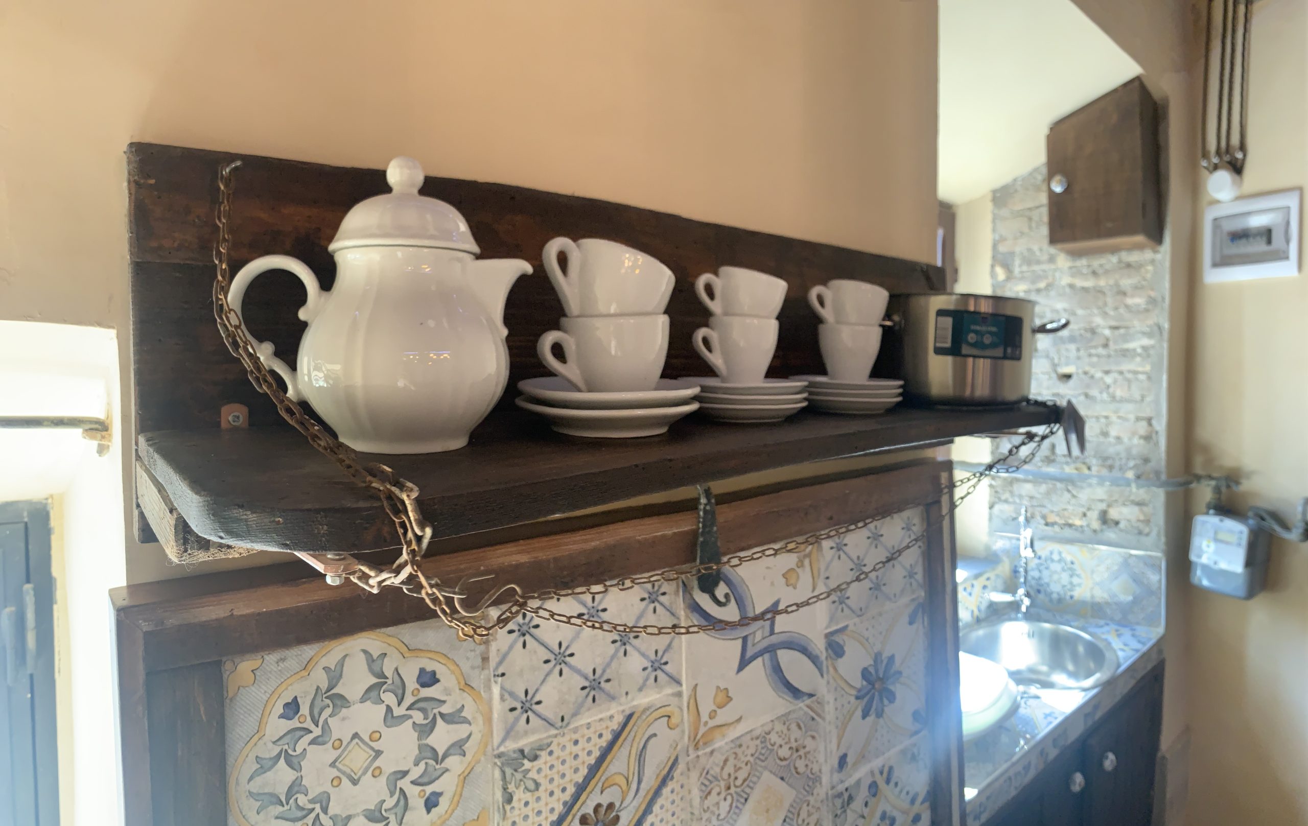 Nella saletta principale è possibile usufruire di una cucina a scomparsa. Un piano cottura a induzione e un piccolo frigobar che scompaiono all’interno di un mobile in legno, decorato con ceramiche di Deruta dipinte a mano. Il lavello in stile vintage, rigorosamente davanti alla finestra che dà sulla piazza principale.