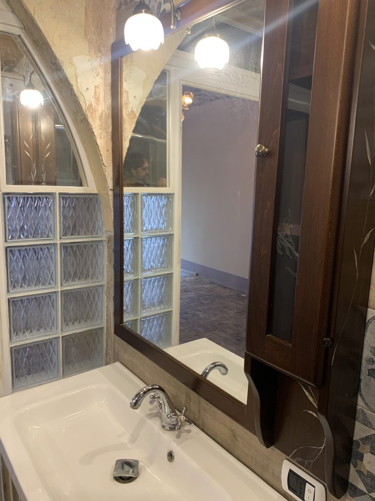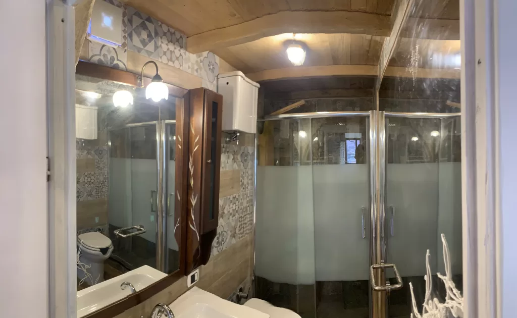 La camera da bagno è piccola e ben organizzata, come il resto dell’abitazione. Ristrutturata in stile da artisti, dispone di una comoda doccia, il water con bidet per i disabili e uno specchio enorme a parete.